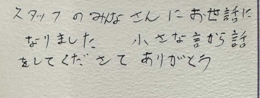 スタッフのみなさんにお世話になりました。小さな事から話をしてくださってありがとう。