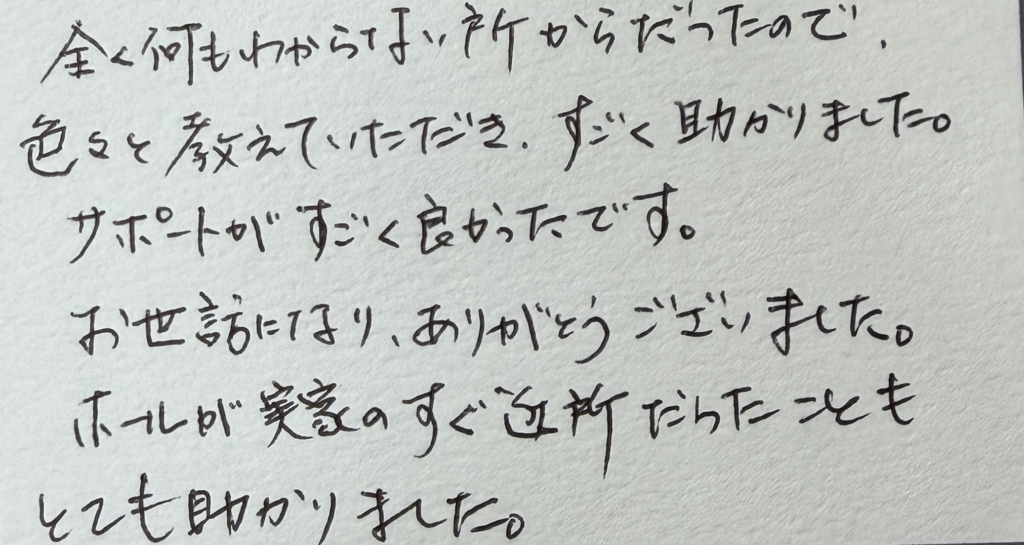 全く何もわからない所からだったので、色々と教えていただき、すごく助かりました。サポートがすごく良かったです。お世話になり、ありがとうございました。ホールが実家のすぐ近所だったこともとても助かりました。
